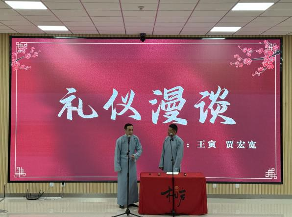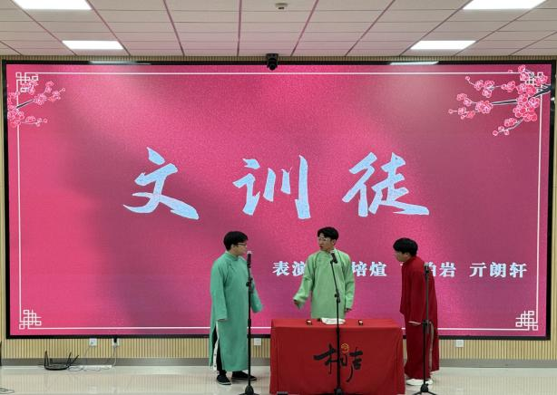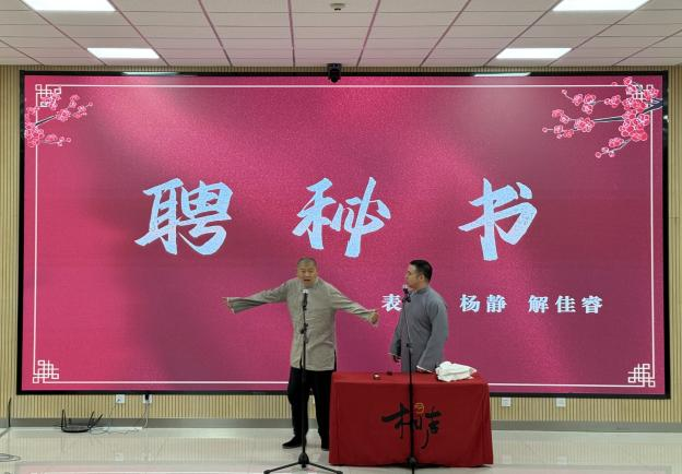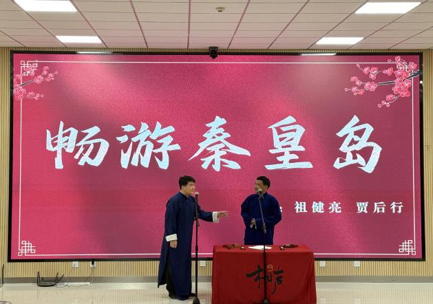 首先,秦皇岛市曲艺家协会贾后行老师与燕大学子祖健亮共同带来的快板《畅游秦皇岛》瞬间点燃了现场气氛。清脆悦耳的竹板声搭配朗朗上口的唱词,以秦皇岛城市风貌为创作核心,表演幽默诙谐、节奏明快,为整场演出营造了欢快热烈的氛围;随后,王寅、贾宏宽老师演绎的《礼仪漫谈》,以风趣独特的视角诠释传统礼仪之道。作品包袱鲜活别致,演员表达生动传神,让观众在欢声笑语中深刻体悟文明之韵与礼仪之美,实现了娱乐性与知识性的巧妙融合;杨静、解佳睿老师带来的《聘秘书》以职场选聘为切入点,暗藏剧情反转与密集包袱,默契表演引爆全场,掌声喝彩接连不断;最后,燕山大学噫鸣相声社武培煊、商伯岩、亓朗轩三位同学凭借扎实的功底、默契的配合将相声《文训徒》演绎得妙趣横生,满场欢笑声中尽显燕园学子的青春风采。