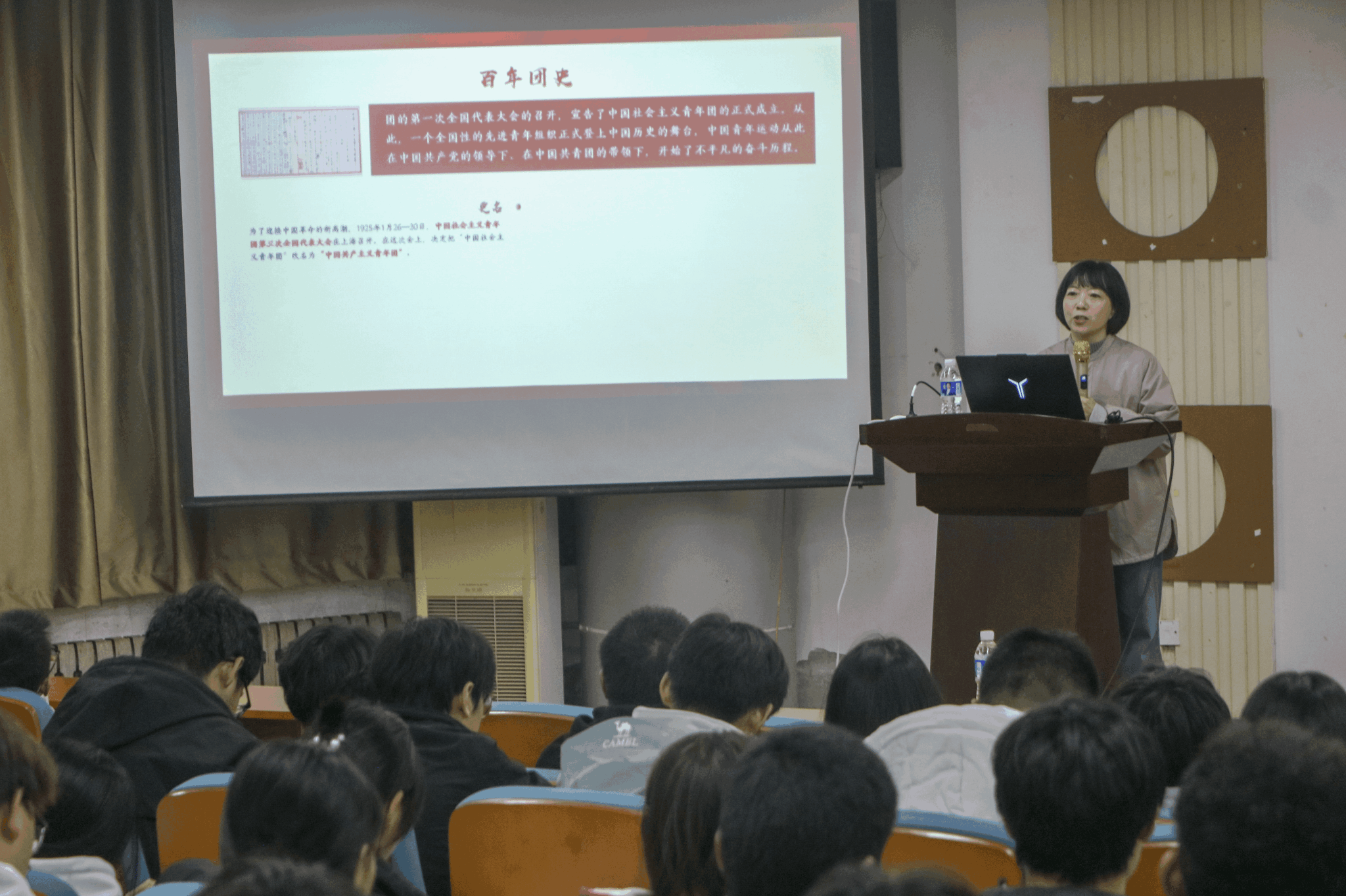 白老师以时间为轴,系统梳理了共青团波澜壮阔的百年历程:从共青团的组建、成立讲到改革开放和社会主义现代化建设新时期的开拓创新,再到新时代的砥砺前行。一段段感人的历史展现出共青团从诞生之初至今的使命担当,让团员青年深刻感受到共青团始终紧跟党的步伐,始终与国家和人民同呼吸、共命运。随后,白老师从入团动机、入团流程和志愿书的撰写等方面进行培训,希望同学们成为“眼中有光、肩上有责、奉献有力、脚下有路”的新团员,让青春在全面建设社会主义现代化国家的火热实践中绽放绚丽之花。