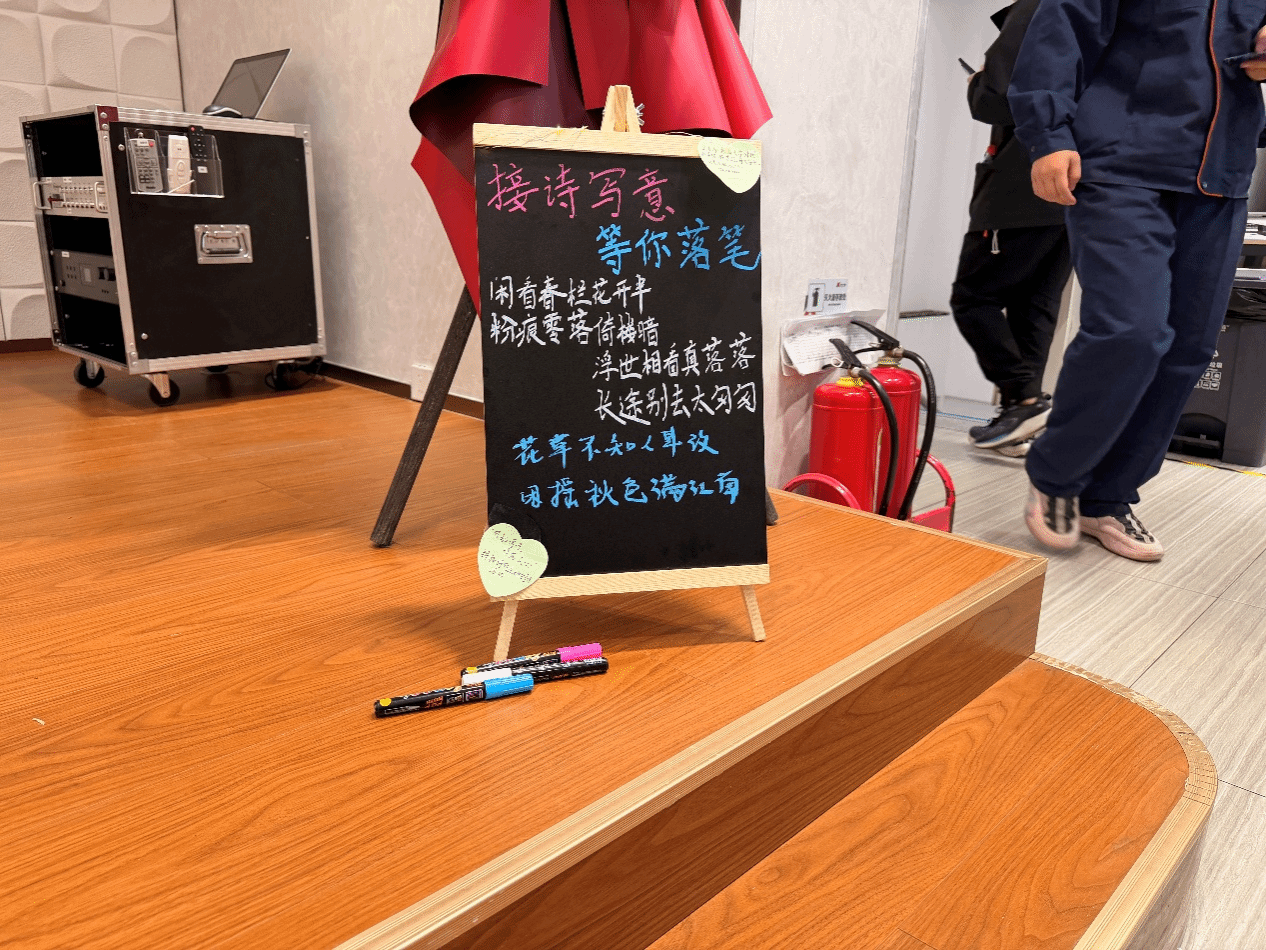 活动现场气氛轻松而富有诗意。无论是驻足片刻的读者,还是即兴落笔的创作者,皆在这一方黑板前留下属于自己的灵感与感受。短短数日间,黑板上逐渐汇聚起多样而真挚的文字:有人抒发青春梦想,有人描摹季节风景,也有人寄托思念与希望。文字在光影间流动,构成了一幅灵动的校园诗篇。文学社成员全程负责现场维护、拍照记录与后续整理展示,确保活动顺利进行。