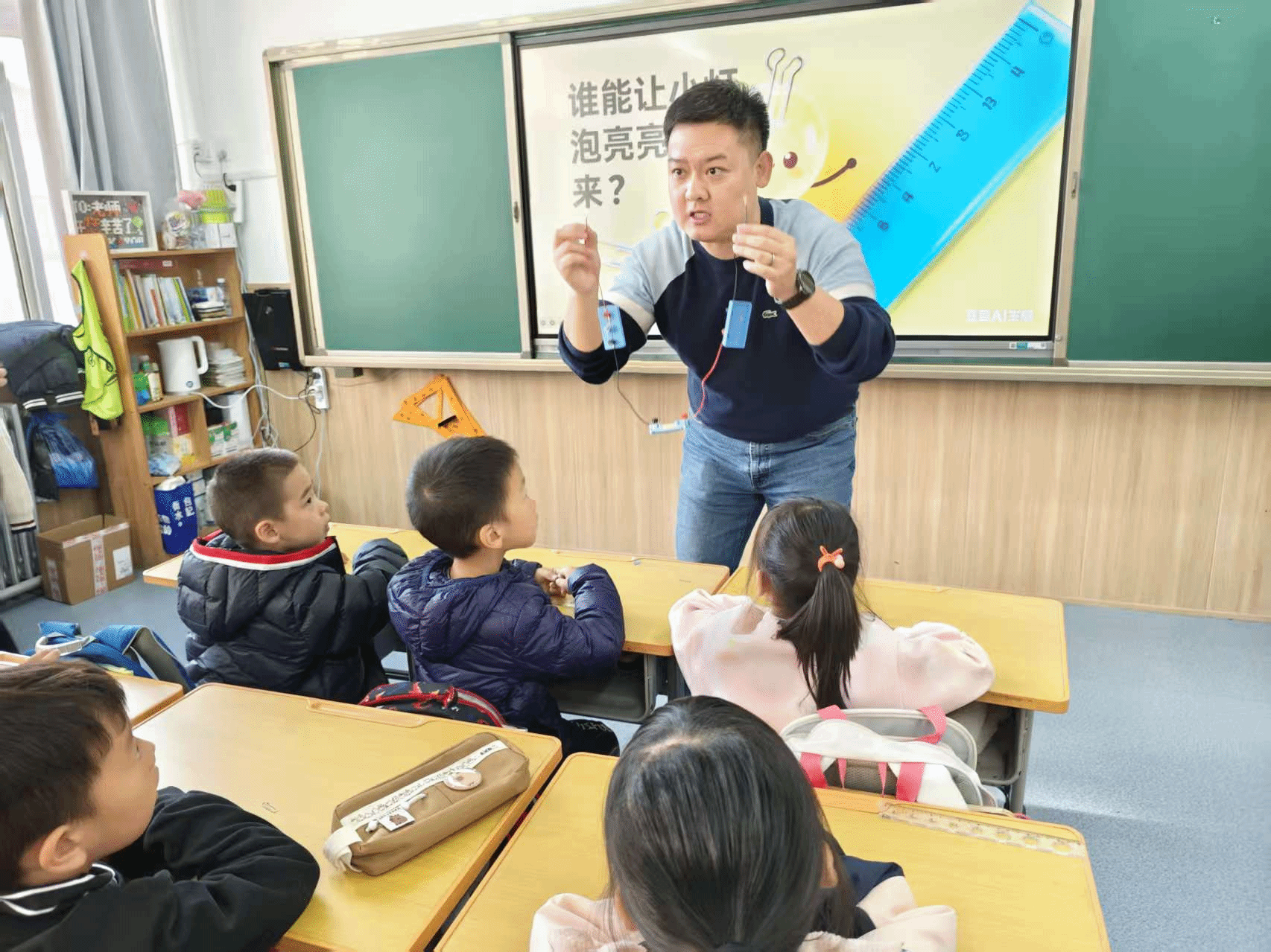 “铅笔能导电吗?拉链头呢?”在导电实验环节,8组学生使用简易电路装置,测试身边常见物品。当曲别针让小灯泡亮起,而塑料尺毫无反应时,孩子们恍然大悟:“原来金属才能导电!”实践不仅验证知识,更点燃了探索热情。随后的记忆合金实验更令人惊叹——被掰弯的合金在热水中自动复原,而普通曲别针却不变。“太神奇了!”现场惊呼连连。老师揭秘:“这就是电热水壶自动断电的原理来源。”“科学就在我们家里!”学生兴奋地说。