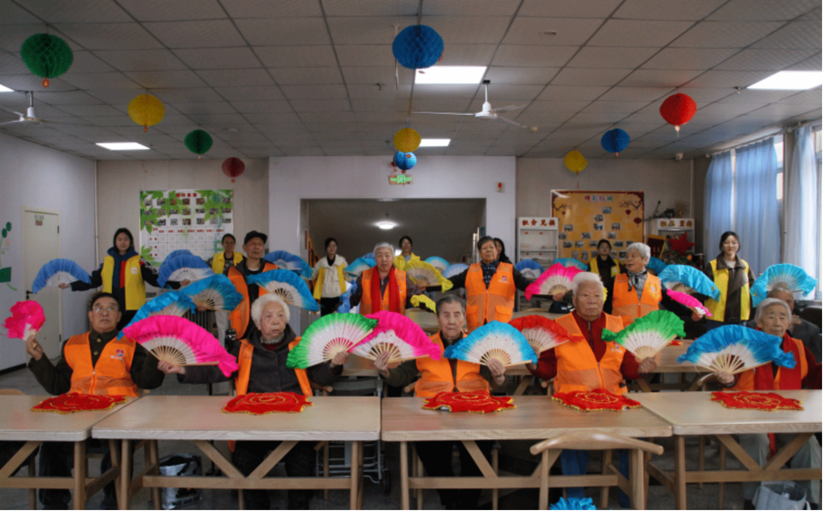 志愿者与老人一同表演扇子舞