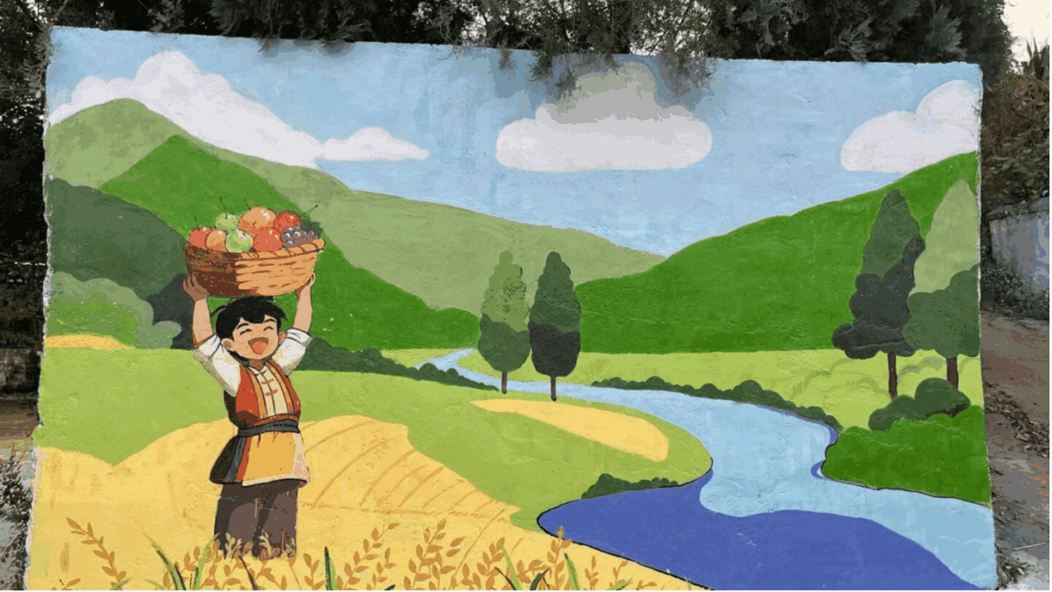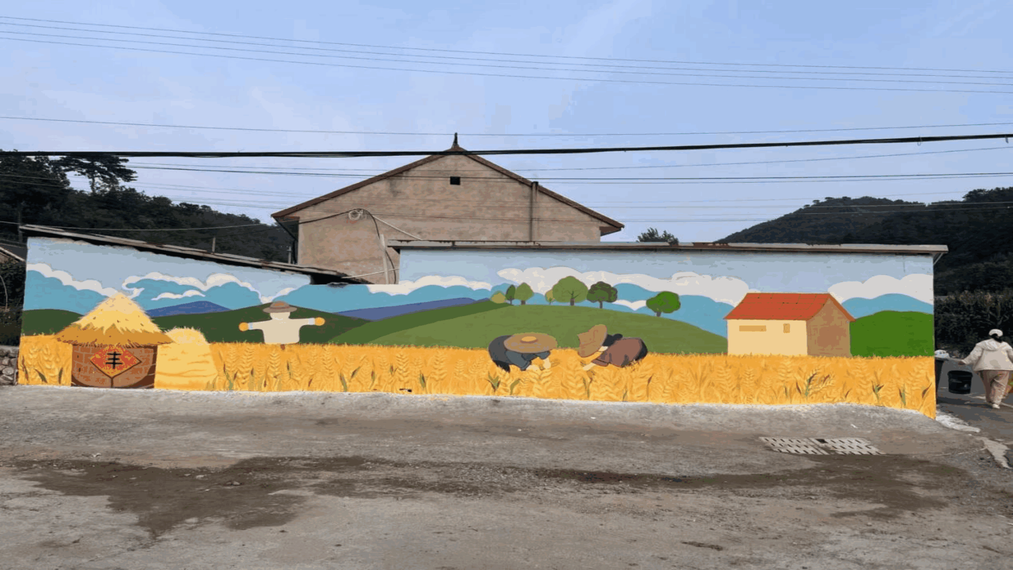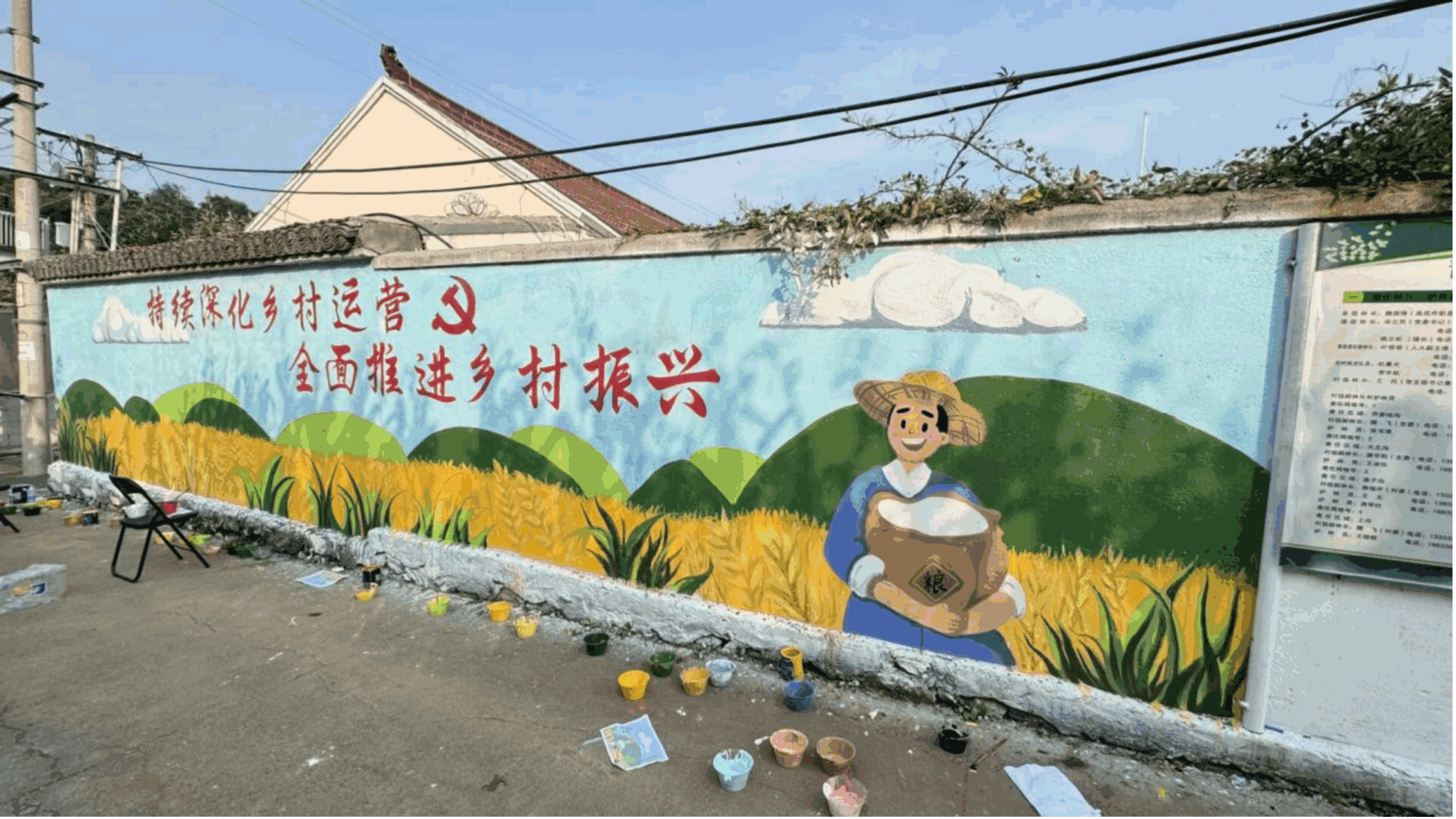 在志愿者们的共同努力下,单调的墙体变成一道亮丽的文化景观。这组墙绘不仅美化了村容村貌,更以直观、生动的艺术形式,唱响了党建引领、奋进丰收的主旋律,为当地乡村振兴注入了新的文化动能。