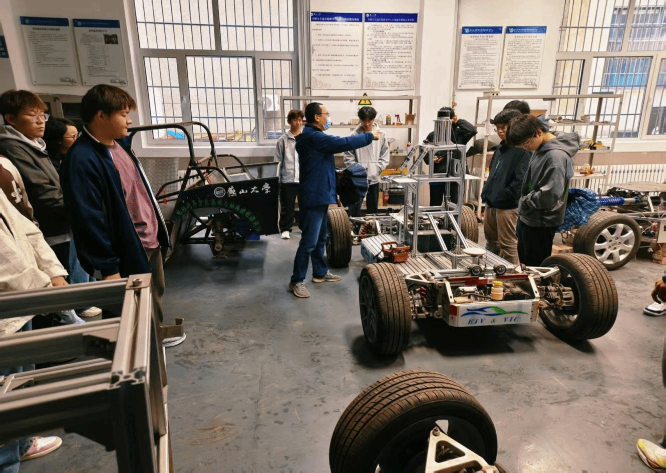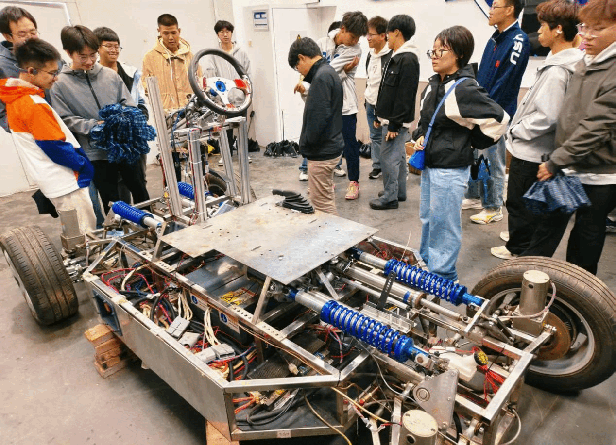 进入车辆工程实验室,实验室分为汽车机械组装、智能化驾驶、氢能源研究三大展示模块,全方位呈现了车辆工程学科的核心方向与前沿动态。在汽车机械组装区域,王文锋老师介绍拆解后的汽车传动系统、底盘结构,详细阐述了各部件的组装逻辑、协同工作原理;在智能化驾驶区域,实验室搭建的模拟驾驶平台与自动驾驶测试场景吸引了大量新生驻足。