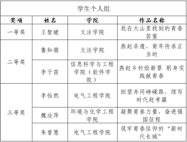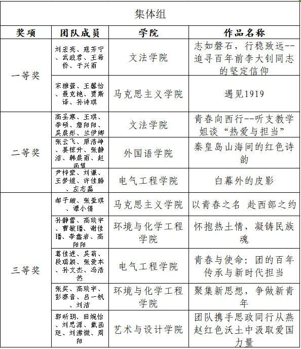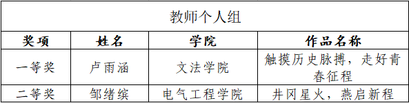 根据团省委《关于举办“团、队携手·思政同行”微团课大赛的通知》精神,校团委组织开展了我校“团、队携手·思政同行”微团课大赛校赛工作。经各学院团委(团总支)推荐、校团委组织专家组评审,现对比赛获奖名单进行公示。