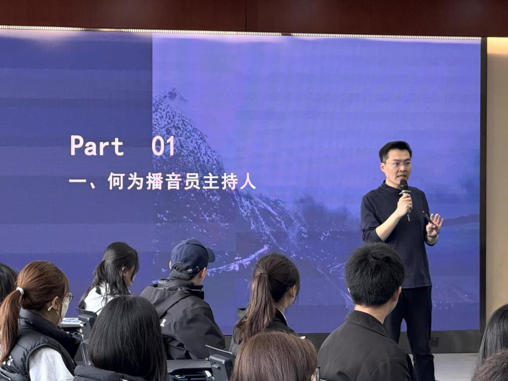 活动现场,张涵硕老师紧扣“声音语言艺术”核心主题,围绕三个环节展开分享。理论讲解环节,老师结合自身多年从业经验与行业典型案例,深入解读主持人的职业内涵、核心职责与专业素养,帮助同学们厘清行业认知、树立正确的职业导向;实践教学环节,老师从交流态度、心理建设、发声技巧三个维度逐步引导,重点讲解科学发声方法、气息控制技巧与语句停顿逻辑,并现场带领同学们练习胸腹式联合呼吸法,同学们热情高涨、积极参与,多位同学主动上台进行稿件朗读,老师逐一细致点评、精准纠错,让大家在实战演练中快速掌握表达技巧,现场学习氛围浓厚;思维拓展环节,老师精心设置多个灵活有趣的互动问题,引导同学们打破思维定式,强化发散性思维训练,鼓励大家大胆思考、踊跃表达。
