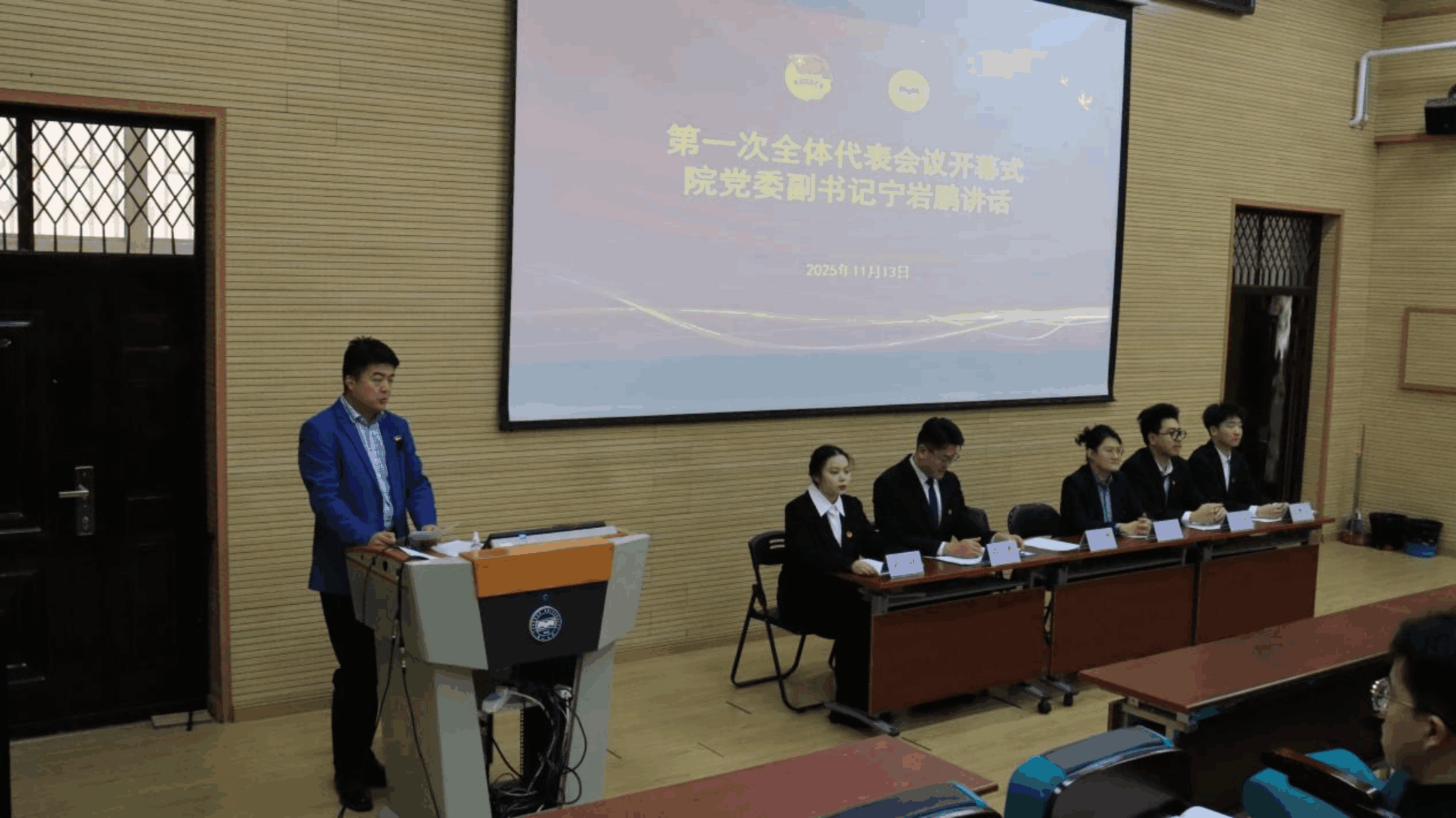 大会在雄壮的中华人民共和国国歌声中开幕。本次大会的主要任务是全面总结学院学生会、研究生会过去一年的工作,谋划2026年及今后一段时期的重点工作。选举产生新一届学生组织主席团成员。大会开始前,全体代表参加了预备会议,对大会议程、审议流程等事项进行了充分讨论和确认。学院党委副书记宁岩鹏代表学院党委向大会的召开表示祝贺。他指出,学院学生组织要坚持党的领导,提升政治站位,增强围绕中心、服务大局的意识和能力;要不断加强个人修养与专业能力的提升,在学习与实践中磨砺本领;要坚持组织改革与自我教育相结合,不断提升服务意识和工作质量,为学院高质量发展贡献青春力量。