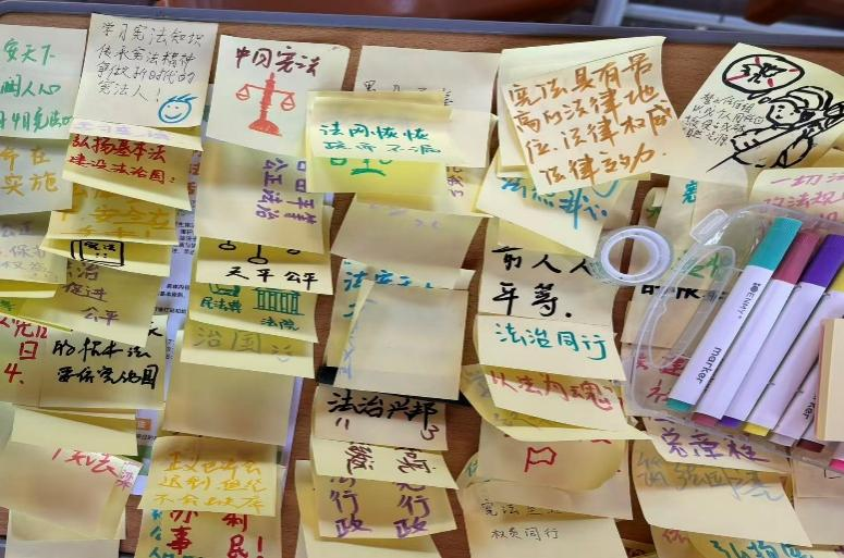 活动期间,同学们积极参与,活动现场设置绘画标语与猜谜两大区域。绘画区内,同学们以法槌、天平、宪法拟人形象等为主题进行创作,将宪法的形象具象化;或自行设计两到三个宪法宣传标语,展现出其心中对“公平”的理解;在妙趣横生的猜谜区则悬挂若干宪法知识谜题,同学们踊跃竞猜,在破解谜题的过程中,悄然加深了对宪法条款的理解,真正做到了寓教于乐。与此同时,在活动过程中工作人员有序组织登记、答疑,为同学们提供帮助,保障了活动顺利开展。