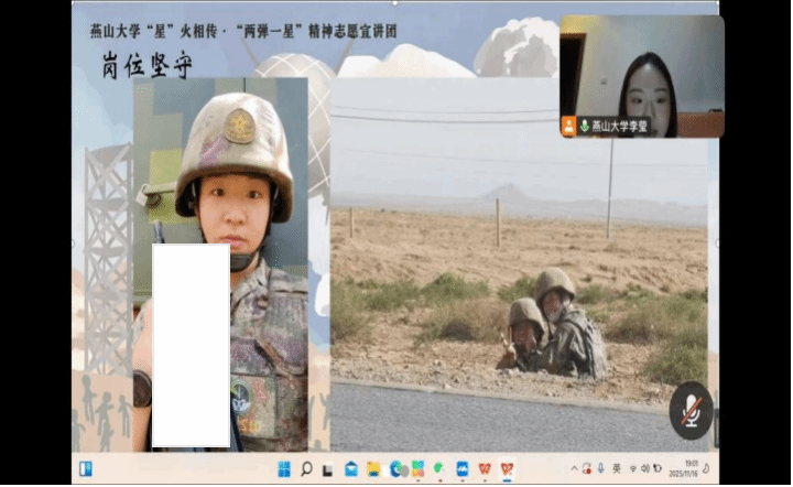 为弘扬爱国精神,激励青年学子树立远大理想,11月16日,文法学院(公共管理学院)“星”火相传“两弹一星”精神宣讲团走进我校研究生支教团服务学校——四川省布拖中学,为那里的高中生们带来了一场题为“从‘两弹一星’到绿色军营——跨越时代的青春选择”的云端宣讲。本次宣讲由宣讲团成员、曾服役于中国人民解放军某部队的李莹同学担任主讲。