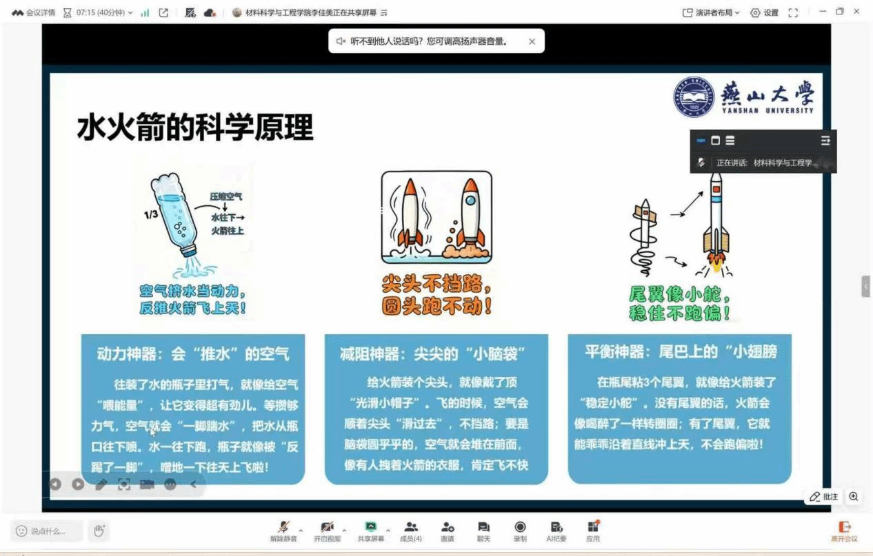 活动当天,线上直播在生动的水火箭科普视频中拉开序幕,瞬间点燃了同学们的好奇心。随后,科普志愿者用通俗易懂的语言拆解水火箭“反作用力推进”的核心原理,搭配生活实例类比,让抽象的力学知识变得直观易懂。