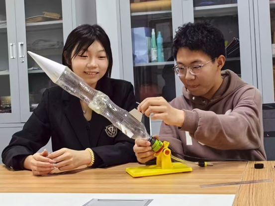活动前期,“师生协力”科普团耗时多日精心筹备,系统梳理水火箭飞行原理、力学知识关联点,制作了兼具科学性与趣味性的科普PPT、动画短片及分步讲解视频,同时,他们还对水火箭制作材料清单进行了反复核验,从材料的安全性到操作的便捷性,每一个环节都严格把关,确保小学生们能够在安全的前提下轻松上手,尽情享受科学实践的乐趣。