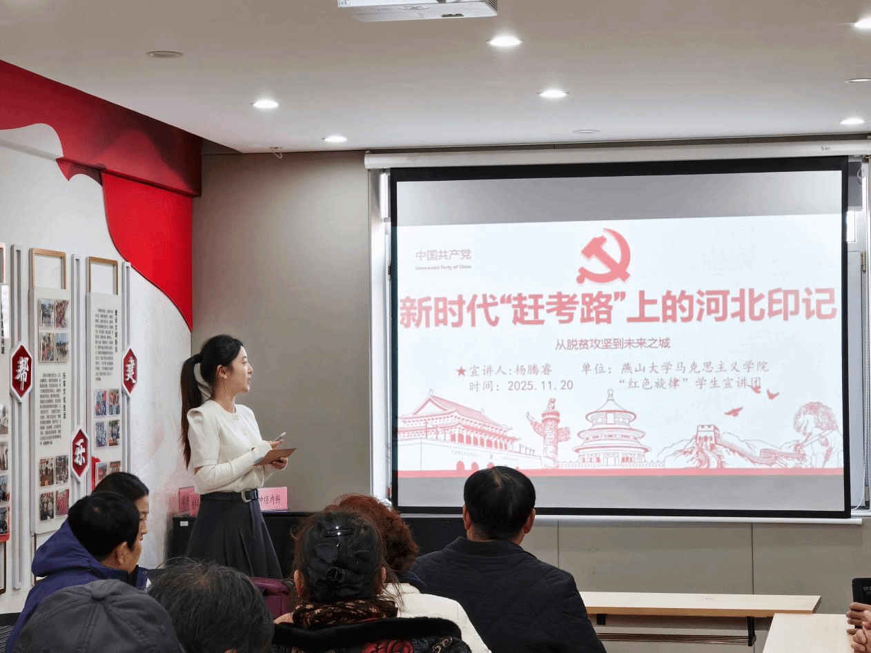 为深入学习宣传贯彻习近平新时代中国特色社会主义思想,进一步弘扬河北红色文化,走好新时代“赶考路”,2025年11月20日,燕山大学马克思主义学院“红色旋律”学生宣讲团与学生党支部走进海港区人民里社区,开展了一场以《新时代“赶考路”上的河北答卷》为主题的宣讲活动,与社区党委近三十名党员展开近距离对话,共同了解新时代河北奋斗的历程。