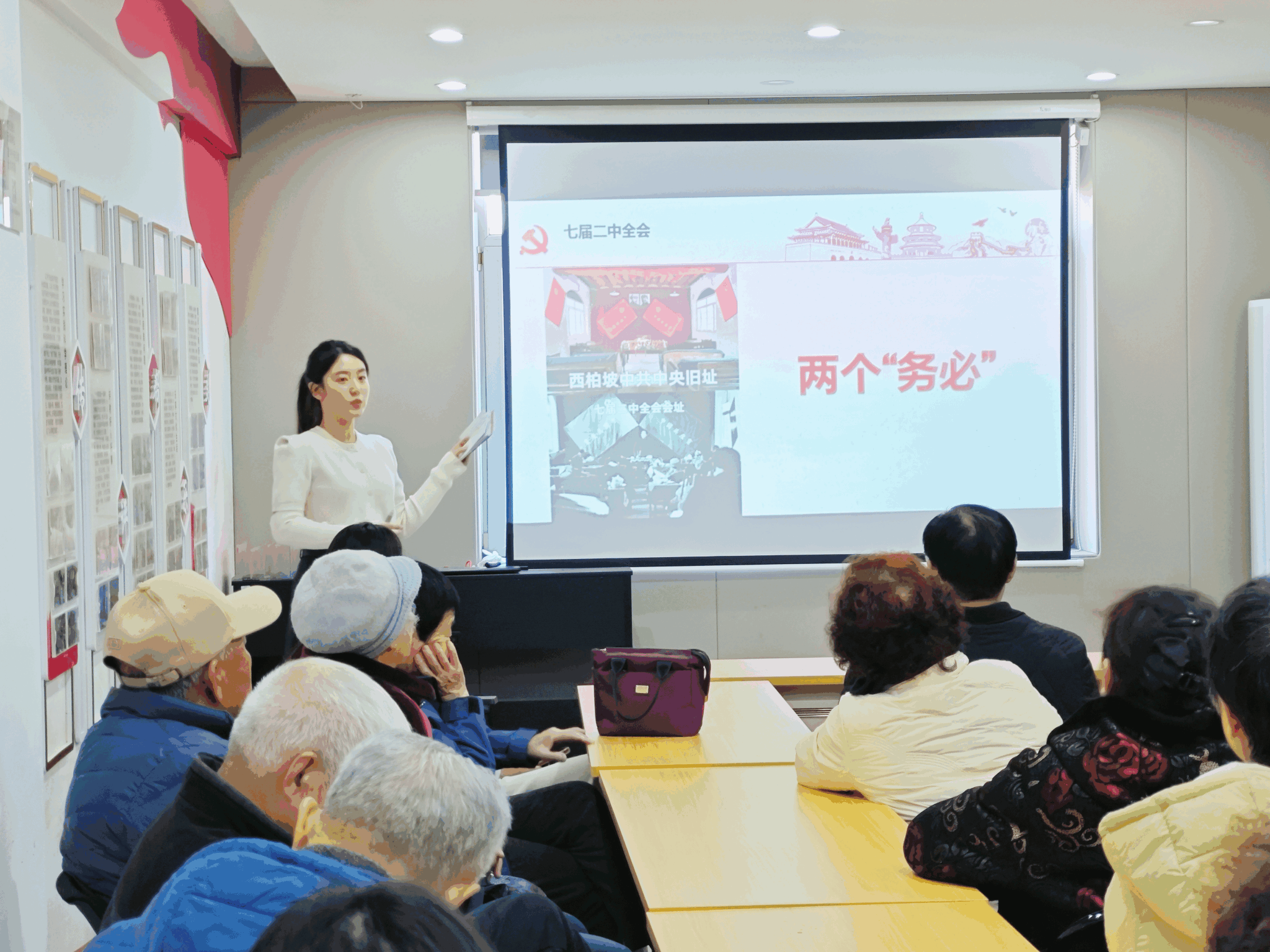 宣讲现场,宣讲人杨腾睿以西柏坡发生的三件大事为切入点,带领社区居民重温了新中国诞生前夜在西柏坡发生的一系列重大历史事件。她用生动详实的讲述,重点阐释了“两个务必”的深刻内涵和进京赶考的历史意义。她特别强调,西柏坡不仅是中国革命从农村走向城市的转折点,更是一座精神丰碑,其蕴含的敢于斗争、依靠群众、戒骄戒躁的革命精神,在今天依然闪耀着时代光芒。