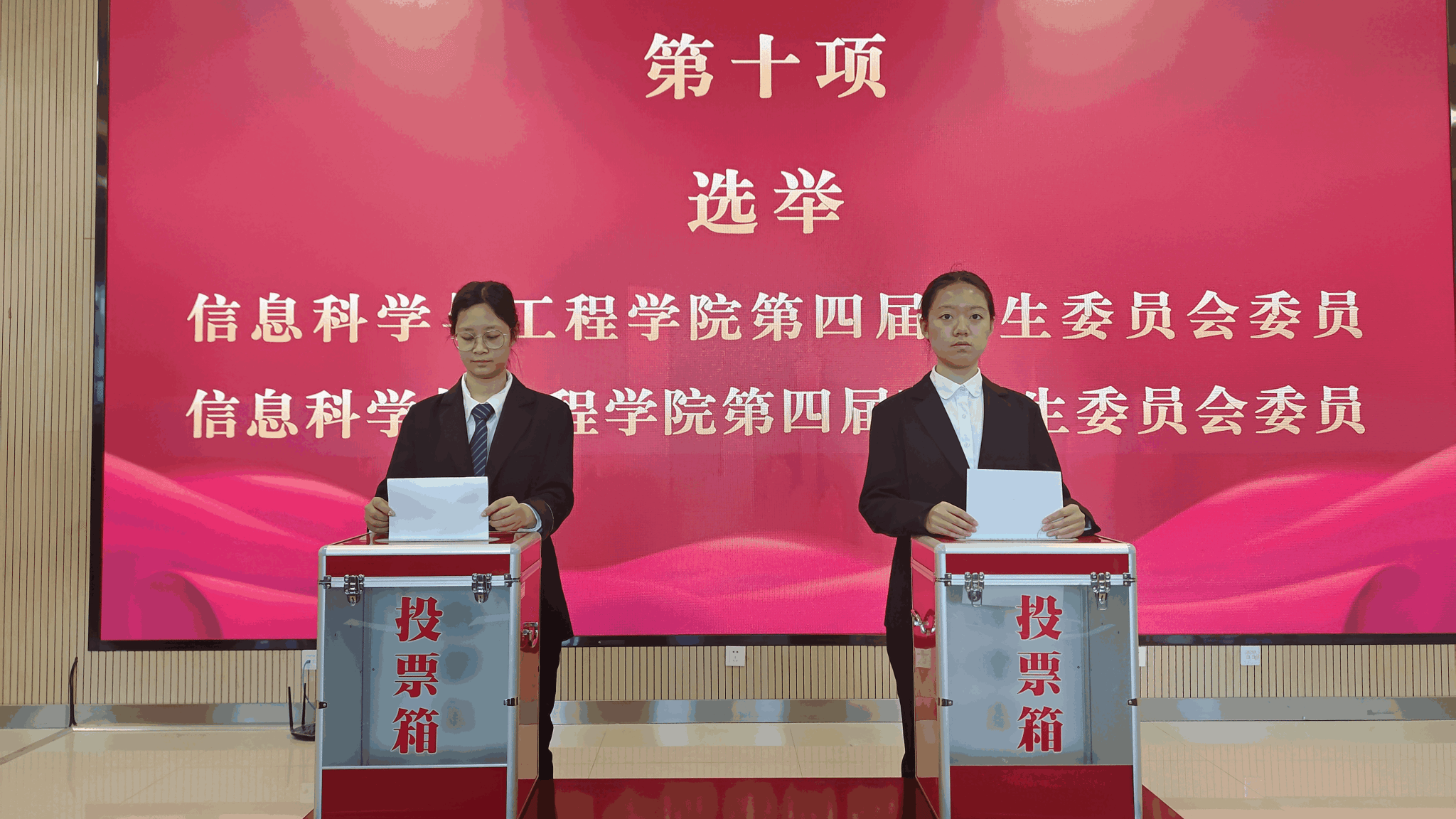在监票人的全程监督下,差额选举产生了第四届学生委员会和第四届研究生委员会,选举产生了新一届学生会、研究生会主席团。