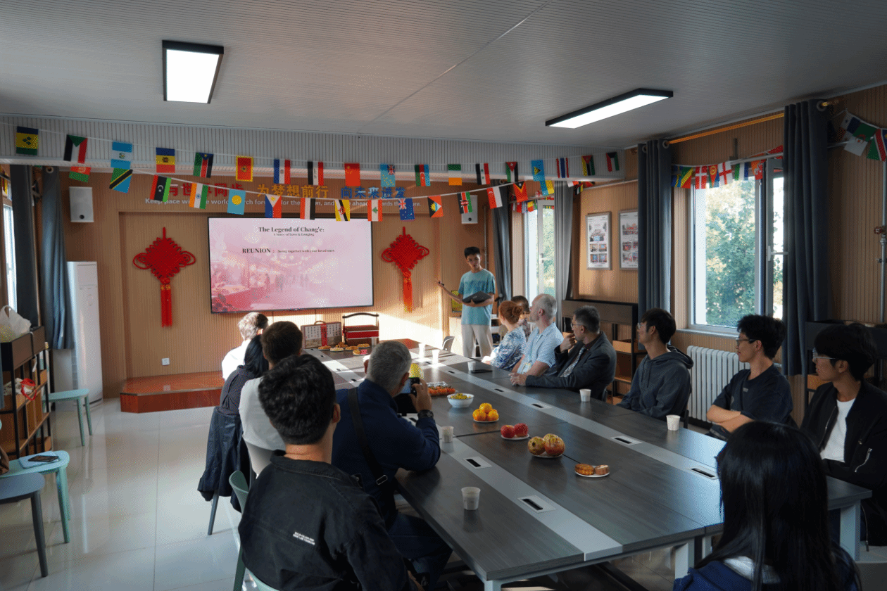 本次活动以中秋文化分享为开端,通过英文PPT形式系统讲解了中秋节起源、“嫦娥奔月”神话传说以及“团圆”的核心寓意。同时,学生代表还介绍了月饼的历史渊源,包括古代祭月习俗、元末起义相关传说,以及中国各地月饼的风味特色,让中外师生对中秋文化有了更深入的理解。