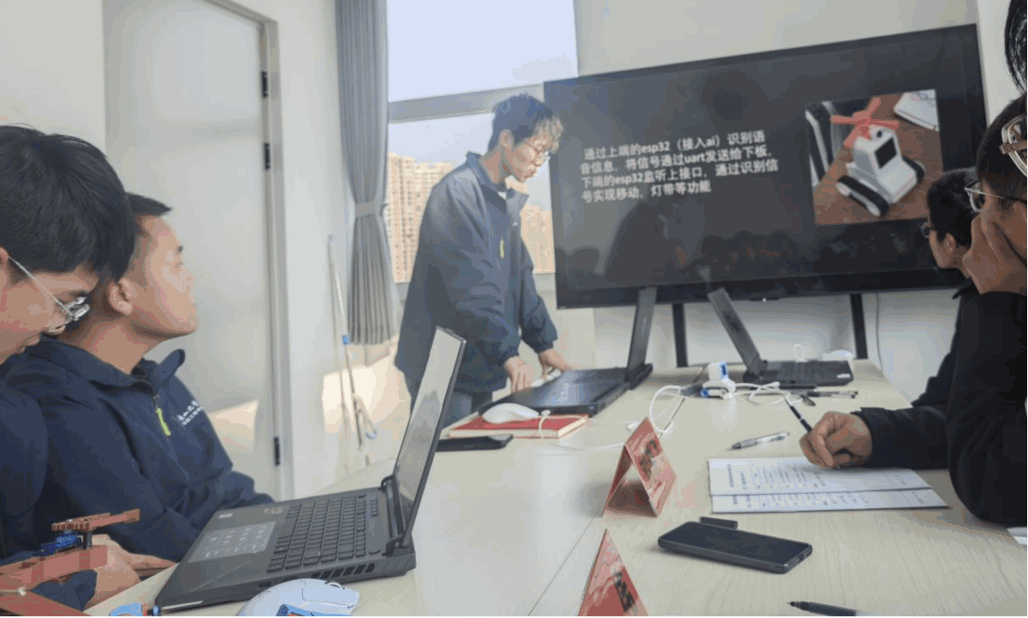 学院科研科科长蔡伟老师,机电系副教授刘晓飞老师受邀担任本次总结汇报会的评审,会议由学院团委书记王世运主持。会上,各实践小组依次进行成果汇报,围绕六足仿生机器人和小智桌面AI智能机器人两个项目,重点介绍了项目设计思路、系统搭建过程、功能实现情况以及实践过程中的收获与思考,全面展示了小学期期间的学习成果。