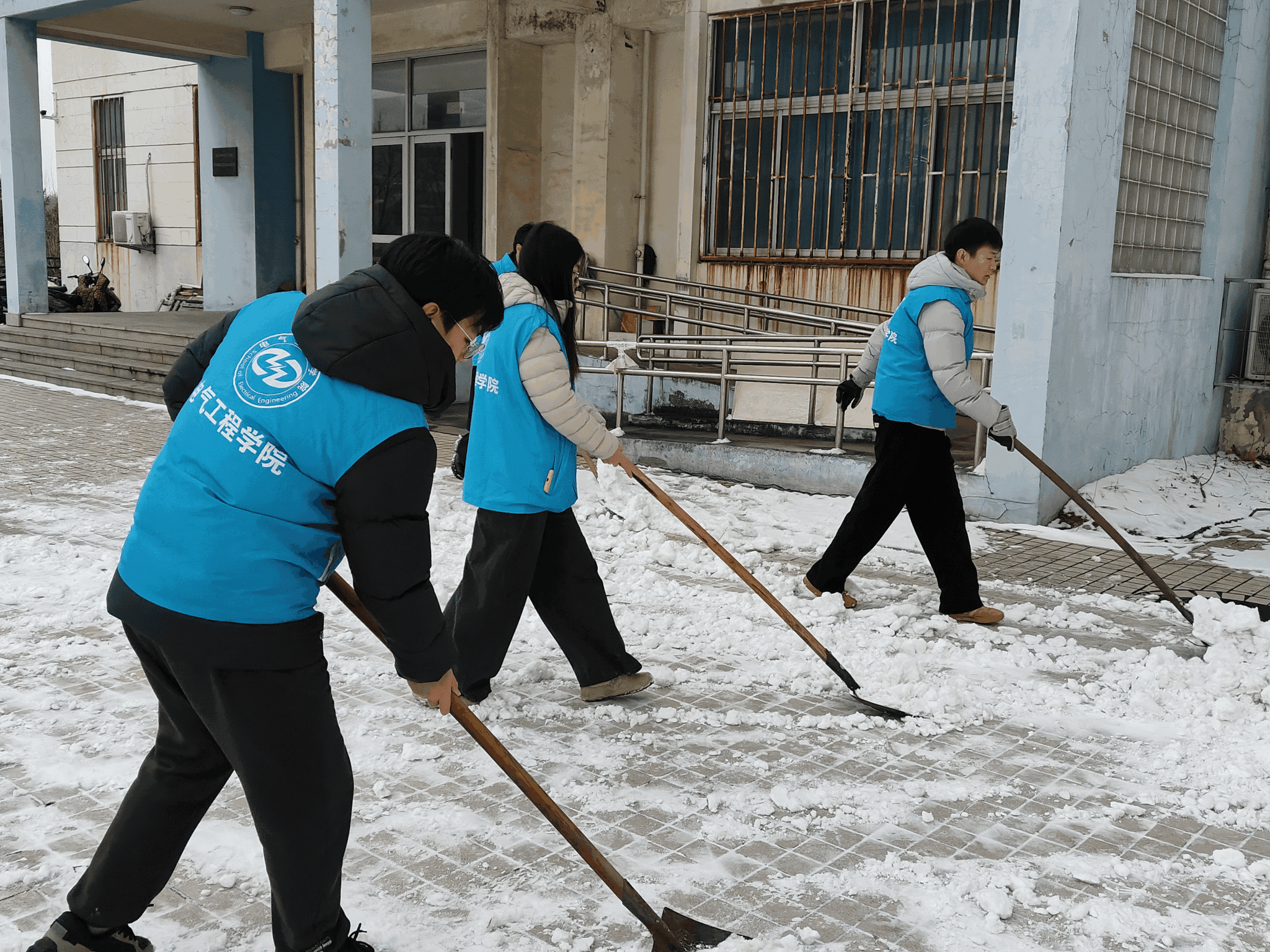现场,没有严格的区域划分,却有着天然的默契。有同学主动承担起破冰的重任,用铁锹将压实的雪块一块块撬起;紧随其后的同学迅速用雪铲将碎雪推至路边;还有细心的同学拿着扫帚,仔细清理着台阶和门口残留的雪沫,防止再次结冰。