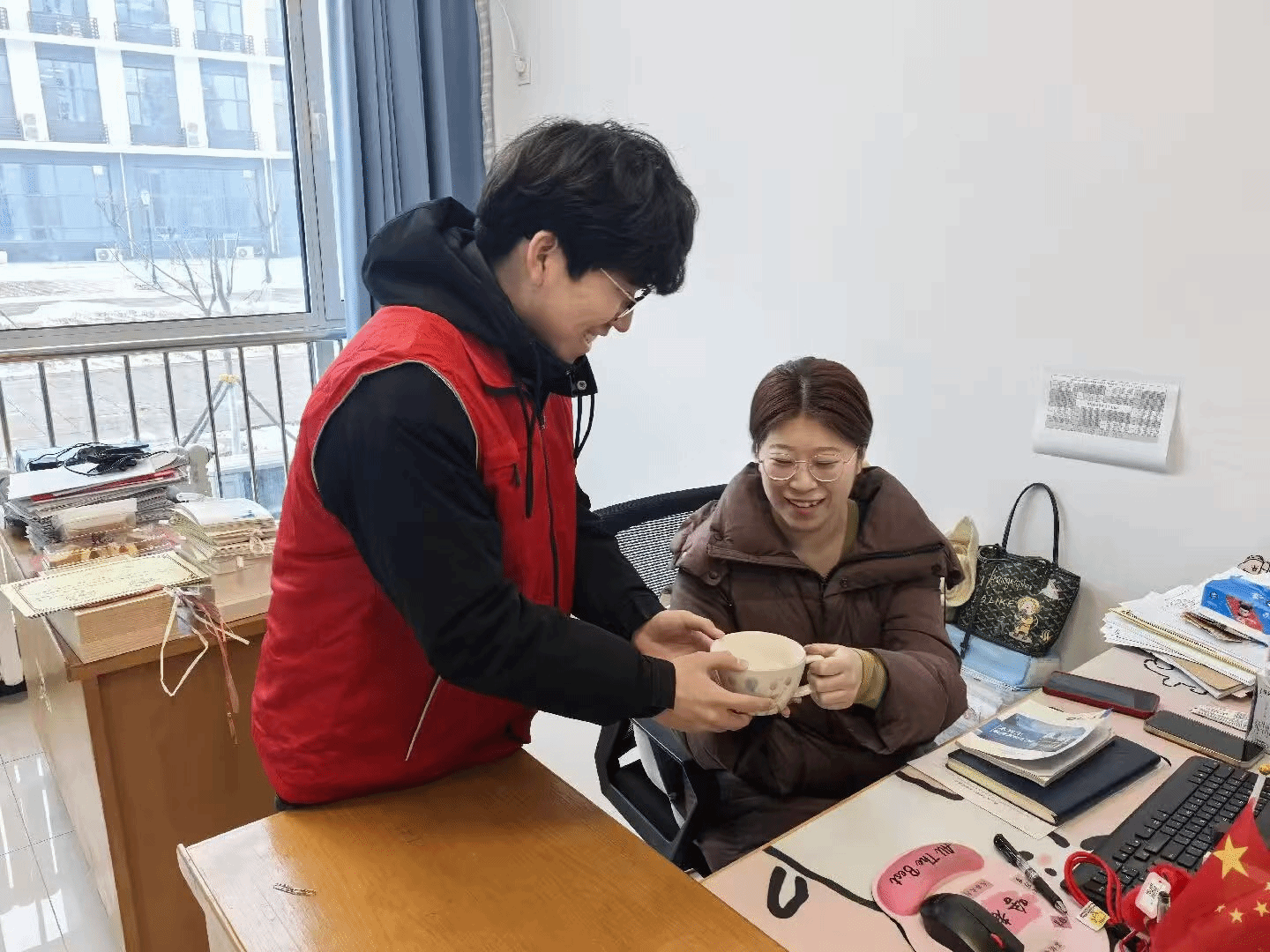 图2一杯热水暖师心,志愿温情润校园