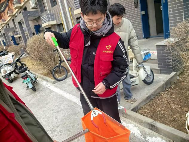 另一队志愿者走进社区街道和娱乐室,清扫路面,捡拾垃圾。志愿者们三五一组,手持扫帚、簸箕和垃圾袋,细致清理道路两侧的落叶、纸屑和塑料包装并将其分类,俯身捡拾绿化带中的隐藏垃圾。清扫完成后志愿者们还在娱乐室与老人们闲聊,倾听他们的故事。