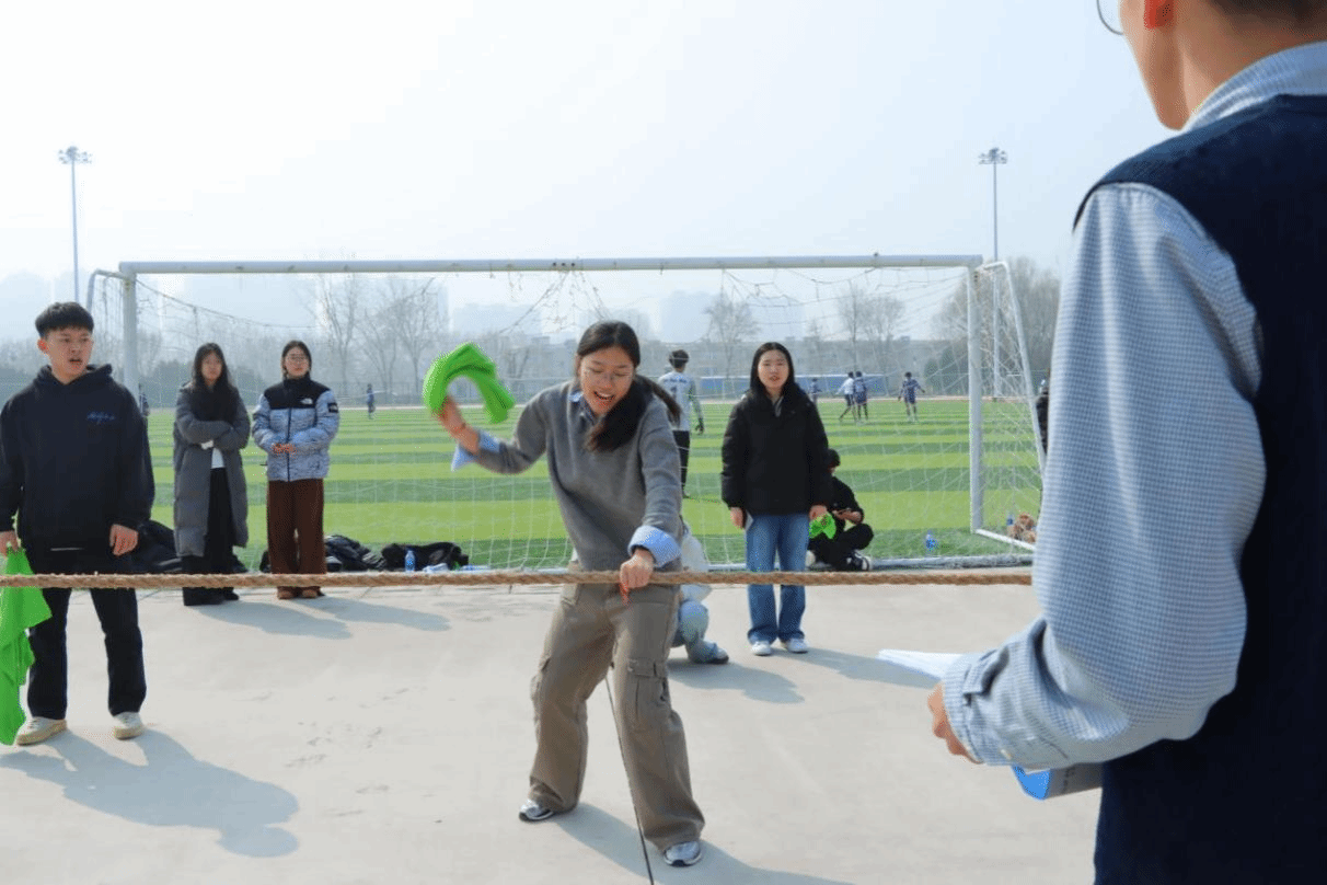 赛场上,参赛队员们紧握长绳、身体后倾、双脚蹬地,齐心协力向各自方向发力。大家咬紧牙关、目光坚定,口号声与呐喊声交织在一起,将青春的力量与拼搏的热情展现得淋漓尽致。场边拉拉队自发助威,现场气氛热烈高涨。