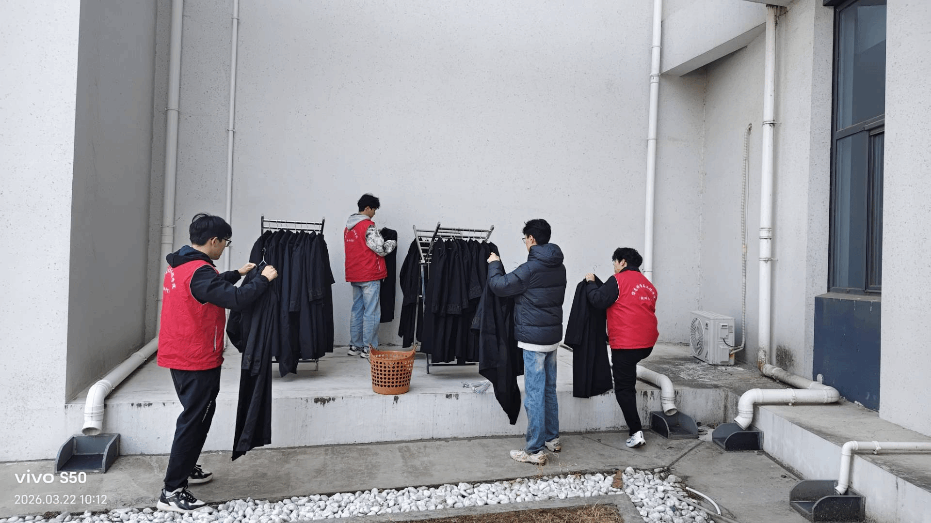 活动中,志愿者们分工明确,配合默契。大家按照规范流程,对学位服进行细致检查、分类、清洗、整理挂放。志愿者们始终保持着耐心与细致,确保每一件学位服都能洁净如新,为即将毕业的学长学姐们送上了一份来自学院的贴心关怀与祝福。