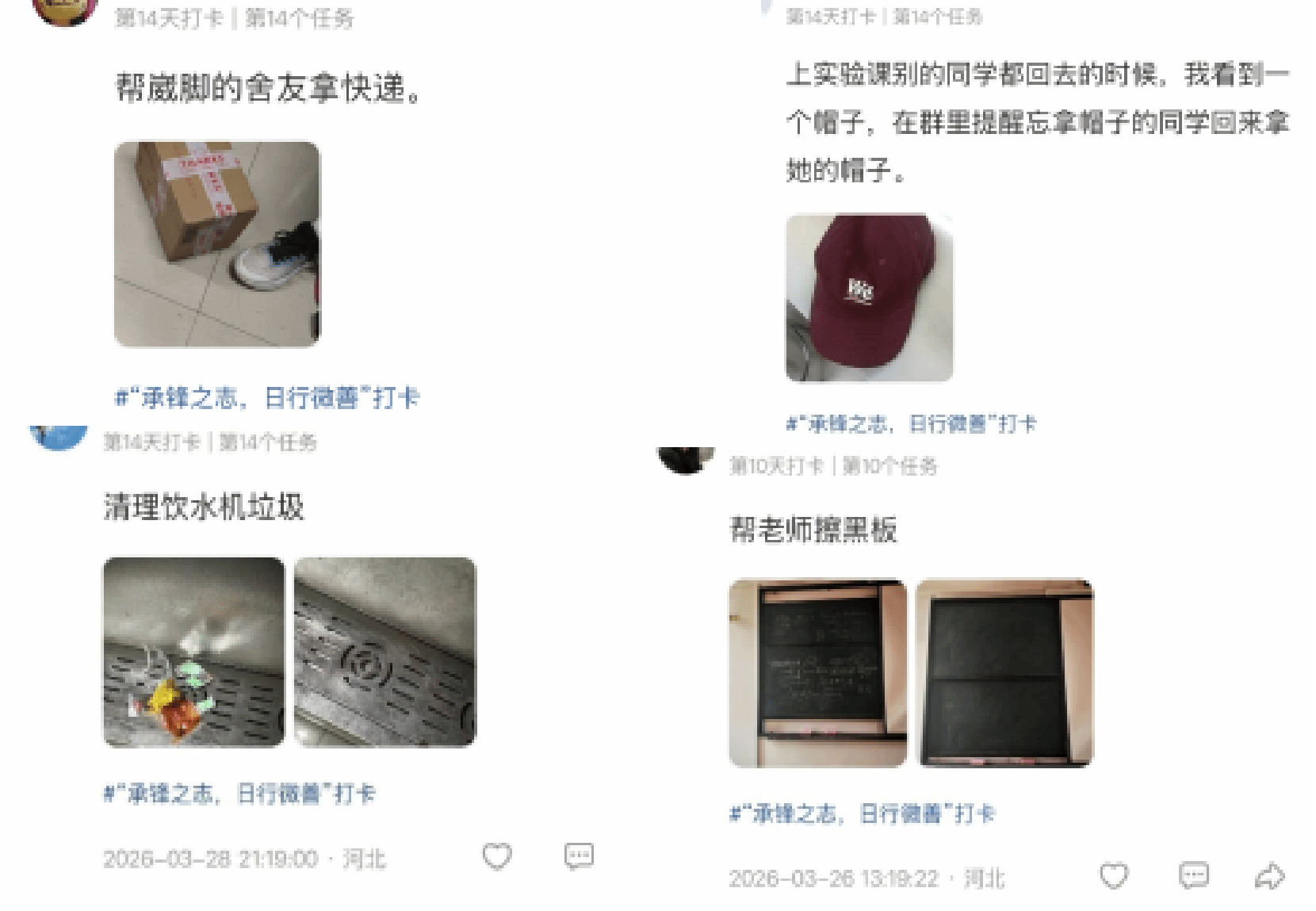 在“实践打卡”板块,鼓励同学们从身边小事做起,无论是随手清理校园垃圾、为同学答疑解惑,还是帮助身边有困难的伙伴,皆可记录分享。这些看似微小的善行,汇聚成一股温暖的青春暖流,生动诠释了“奉献、友爱、互助、进步”的志愿精神,让“日行一善”的理念成为同学们的行动自觉。