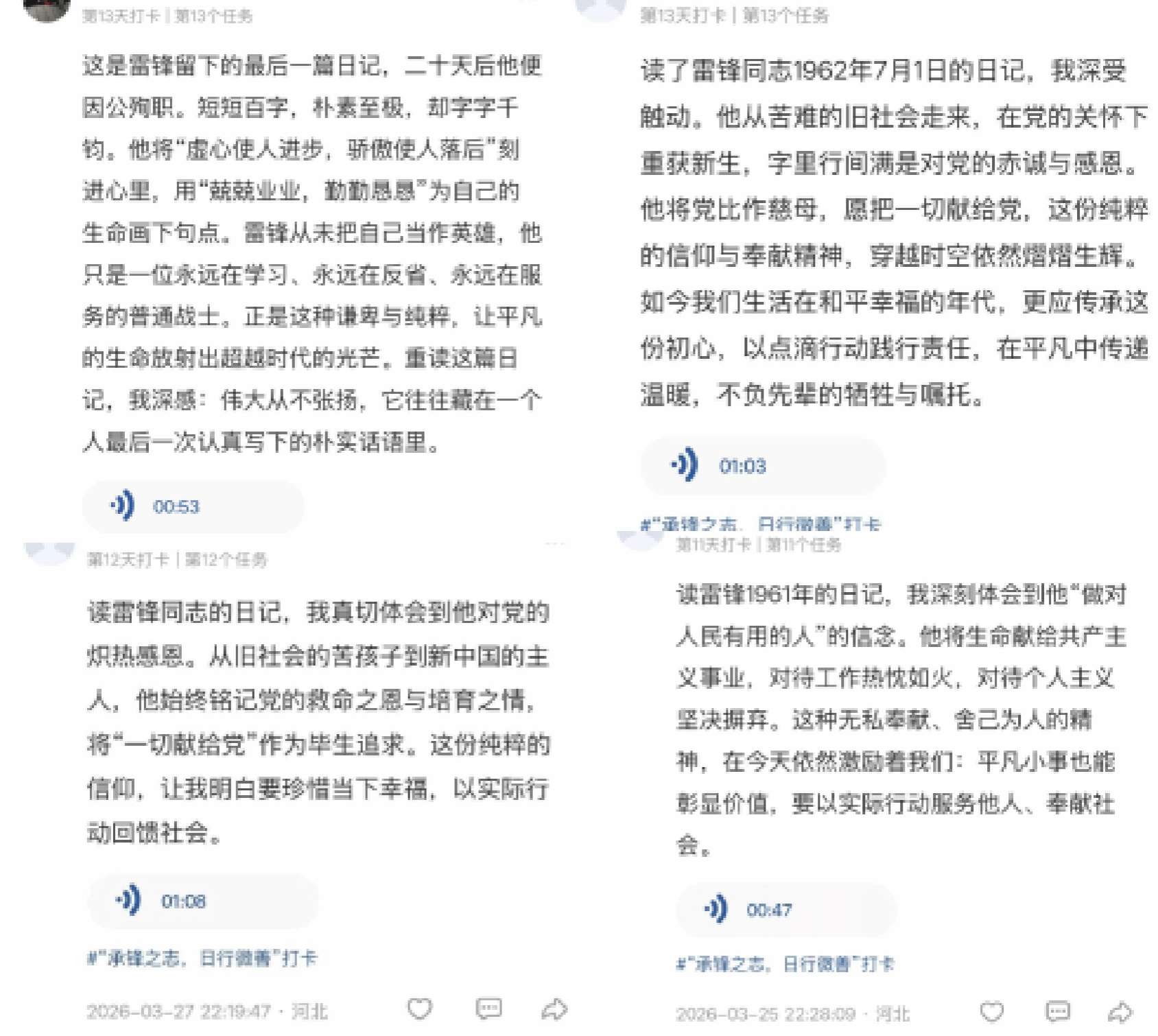 活动设置了“阅读感悟”与“实践打卡”两大板块,双线并进,知行合一。在“阅读感悟”板块,每日精选《雷锋日记》经典篇目进行分享,引导同学们在阅读中思考,在文字书写中感悟,将对雷锋精神的理解与个人成长紧密结合,真正做到入脑入心。