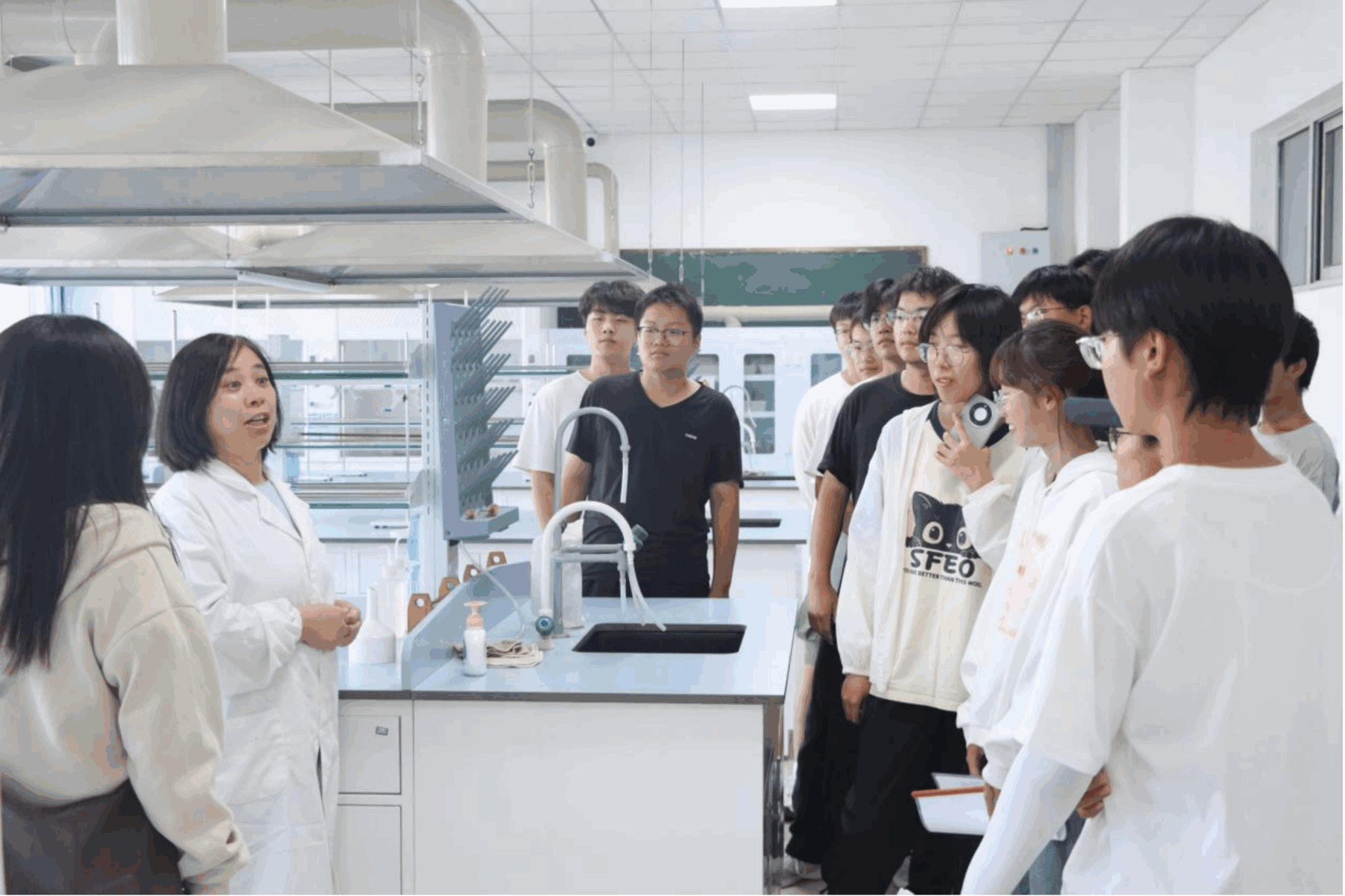 在工作人员的带领下,同学们分组有序地参观了各专业实验室,初步认识了各类精密仪器,详细了解了实验室的基本规章制服。在专业实验室中,教师现场演示了简单而有趣的化学实验,用通俗易懂的语言讲解了酸碱反应等基础化学原理,当不同溶液呈现出红、绿、蓝等多样色彩时,现场响起阵阵惊叹声。随后,同学们在教师指导下亲手操作实验设备,学习 PH 值测定等实用技能,直观感受化学实验的完整过程。同时,教师们还现场演示了喷淋装置、洗眼器、灭火毯等安全设施的使用方法,强调了实验室安全的重要性,增强了新生的安全意识和应急能力。