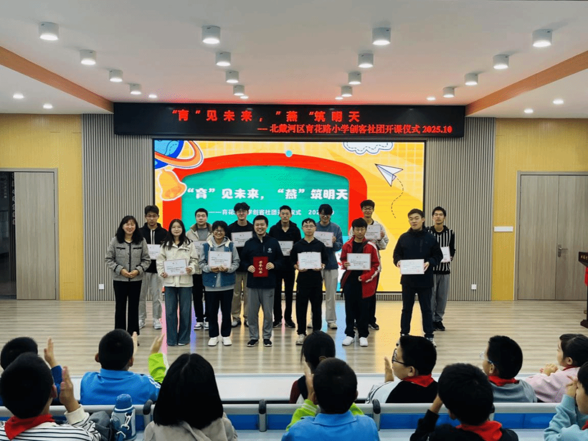2025年10月16日,理学院育燕科教学社与海港区育花路小学的科教合作迎来新篇章——新学期创客课程正式拉开帷幕。开营仪式上,育燕科教学社指导教师李军及13名社员,与育花路小学副校长万晓琨、教导主任潘慧以及24名小学员齐聚一堂,共同见证港城“科教共同体”建设迈出更加坚实的一步。