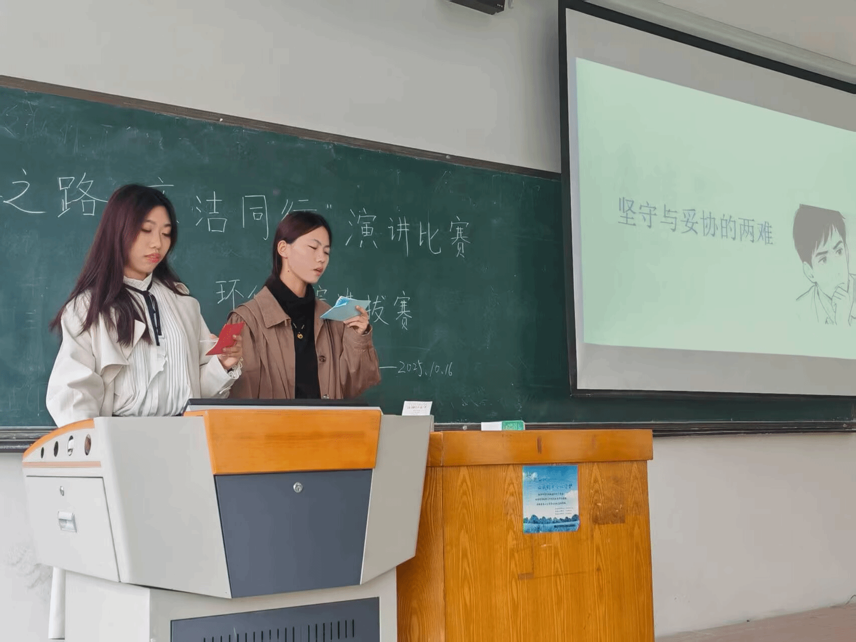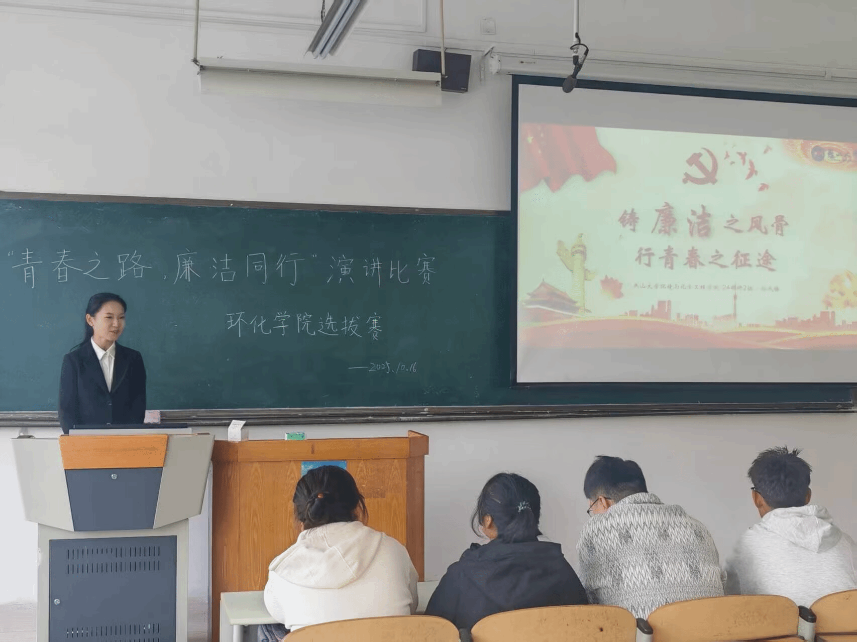 为深入学习贯彻习近平新时代中国特色社会主义思想,扎实推进廉洁文化教育,引导广大青年学子筑牢信仰之基、弘扬清风正气,2025年10月16日下午13:50,环境与化学工程学院在里仁教学楼D104举办“青春之路·廉洁同行”主题演讲比赛院级选拔赛。