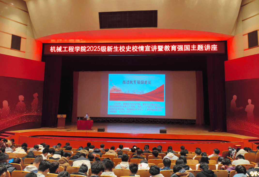 10月19日,机械工程学院在东校区大学生活动中心109室举办2025级新生校史校情宣讲暨教育强国主题讲座。活动特邀东北重型机械学院金相专业1976级毕业生、原燕山大学党委宣传部部长、燕山大学关心下一代工作委员会副主任、秦皇岛市关工委宣讲团讲师白靖担任主讲嘉宾,讲座由2025级本科生辅导员张毅飞主持,学院1300余名2025级本硕士新生现场参与。