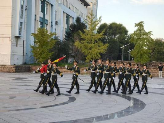 上午6:40,升旗仪式正式开始,国旗护卫队的队员们迈着整齐而坚定的步伐,护卫着五星红旗走向旗杆,全体师生肃穆站立,满怀敬意地行注目礼,并齐声高唱国歌。