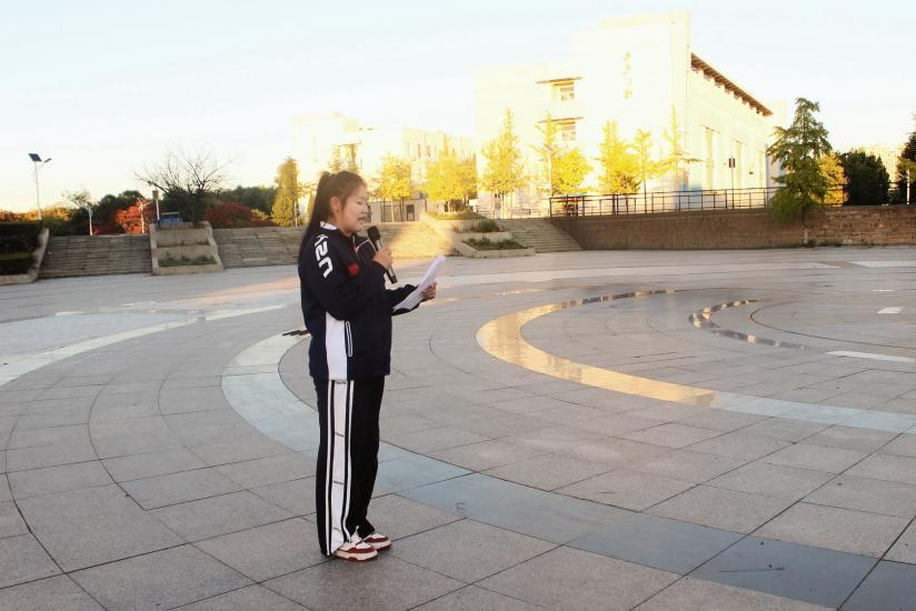 2025级设计学类6班卫佳宇作为学生代表在国旗下发言。他以《以艺术之光,铸时代之美》为题,号召同学们坚定文化自信,植根中华文明厚土,以中华优秀传统文化为创作灵感,用设计服务城乡,拥抱科技浪潮。她表示,新时代艺术青年的“签名”不应只在画室,更应刻在强国建设、民族复兴的伟业中。