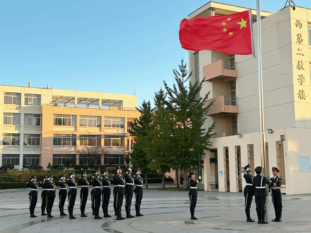 上午6:40,升旗仪式正式开始,在庄严的国歌声中,五星红旗迎着晨光冉冉升起,全体同学行注目礼,齐声高唱国歌。