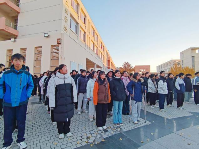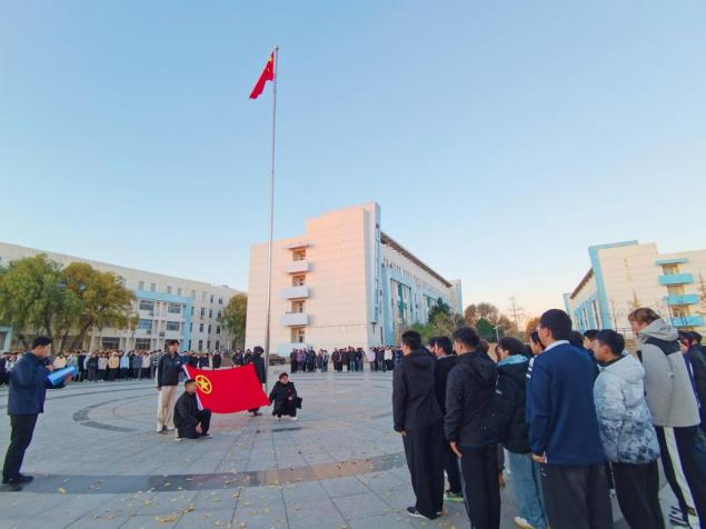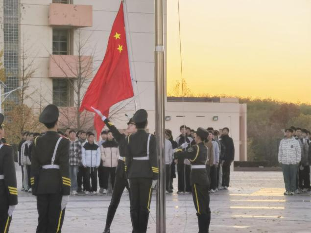 6点40分,升旗仪式在雄壮的氛围中正式开始。在两院师生深情的注目礼下,英姿飒爽的国旗护卫队护送着鲜艳的五星红旗步入广场。伴随着激昂的《义勇军进行曲》,国旗冉冉升起,与初升的朝阳交相辉映。全场师生齐声高唱国歌,歌声嘹亮,展现了两院师生浓厚的家国情怀与奋发向上的精神风貌。