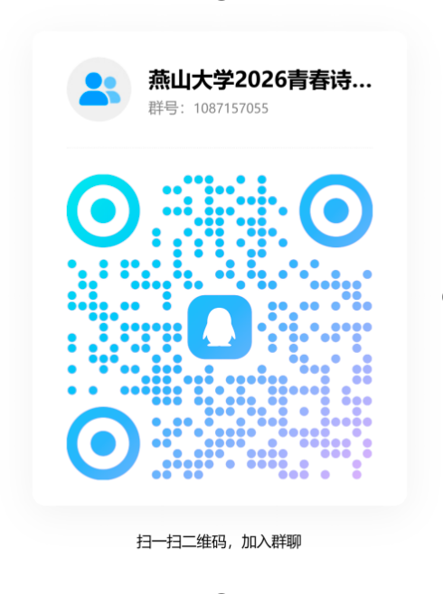 报名方式:请有意参加的同学扫描下方二维码或搜索QQ群号1087157055加入“燕山大学2026青春诗会招募群”,具体报名要求及后续安排将在群内通知。